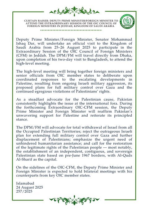 جہاں وہ اسلامی تعاون تنظیم (او آئی سی) کے وزرائے خارجہ کونسل کے غیر معمولی اجلاس میں پاکستان کی نمائندگی کریں گے۔ دفتر خارجہ کے مطابق یہ دورہ 25 تا 26 اگست دو روزہ ہوگا، جس میں وزیر خارجہ فلسطین کی موجودہ صورتحال پر پاکستان کا اصولی اور دوٹوک مؤقف پیش کریں گے۔