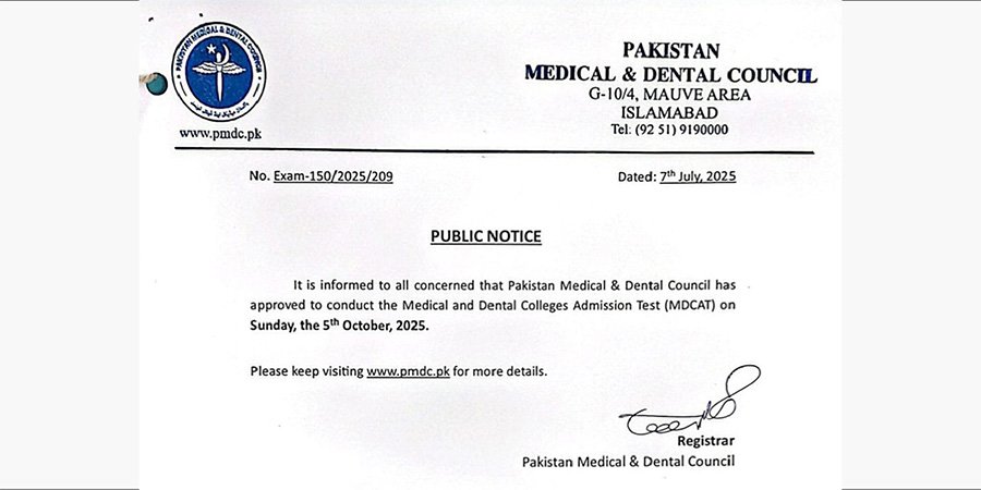 پاکستان میڈیکل اینڈ ڈینٹل کونسل (پی ایم ڈی سی) نے ایم ڈی کیٹ 2025 کے شیڈول کا باقاعدہ اعلان کر دیا ہے۔ اس اہم داخلہ ٹیسٹ کے ذریعے پاکستان کے سرکاری و نجی میڈیکل اور ڈینٹل کالجوں میں داخلہ حاصل کرنے کے خواہشمند طلبہ کو میرٹ پر پرکھا جاتا ہے۔
