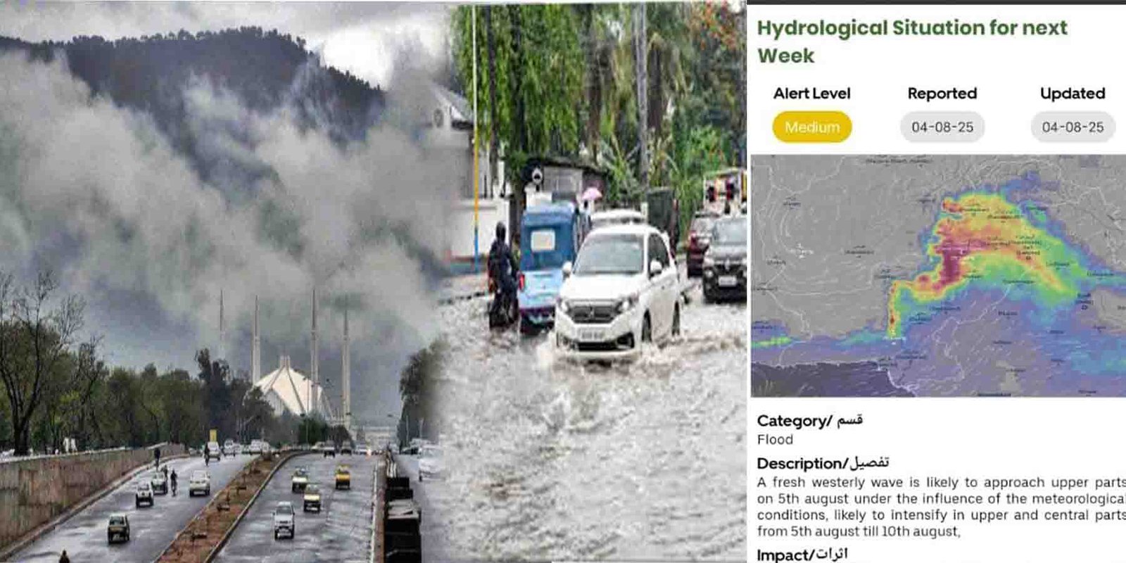5 سے 10 اگست تک بالائی و وسطی علاقوں میں شدید بارشوں سے سیلابی صورتحال کا خدشہ ۔ دریائے چناب (مرالہ، خانکی، قادرآباد) اور دریائے جہلم (منگلا) میں درمیانے سے اونچے درجے کے سیلاب کا امکان۔ دریائے کابل (نوشہرہ) اور سوات، پنجکوڑہ کے ندی نالوں میں طغیانی متوقع۔ pic.twitter.com/3DAl4jBIwe