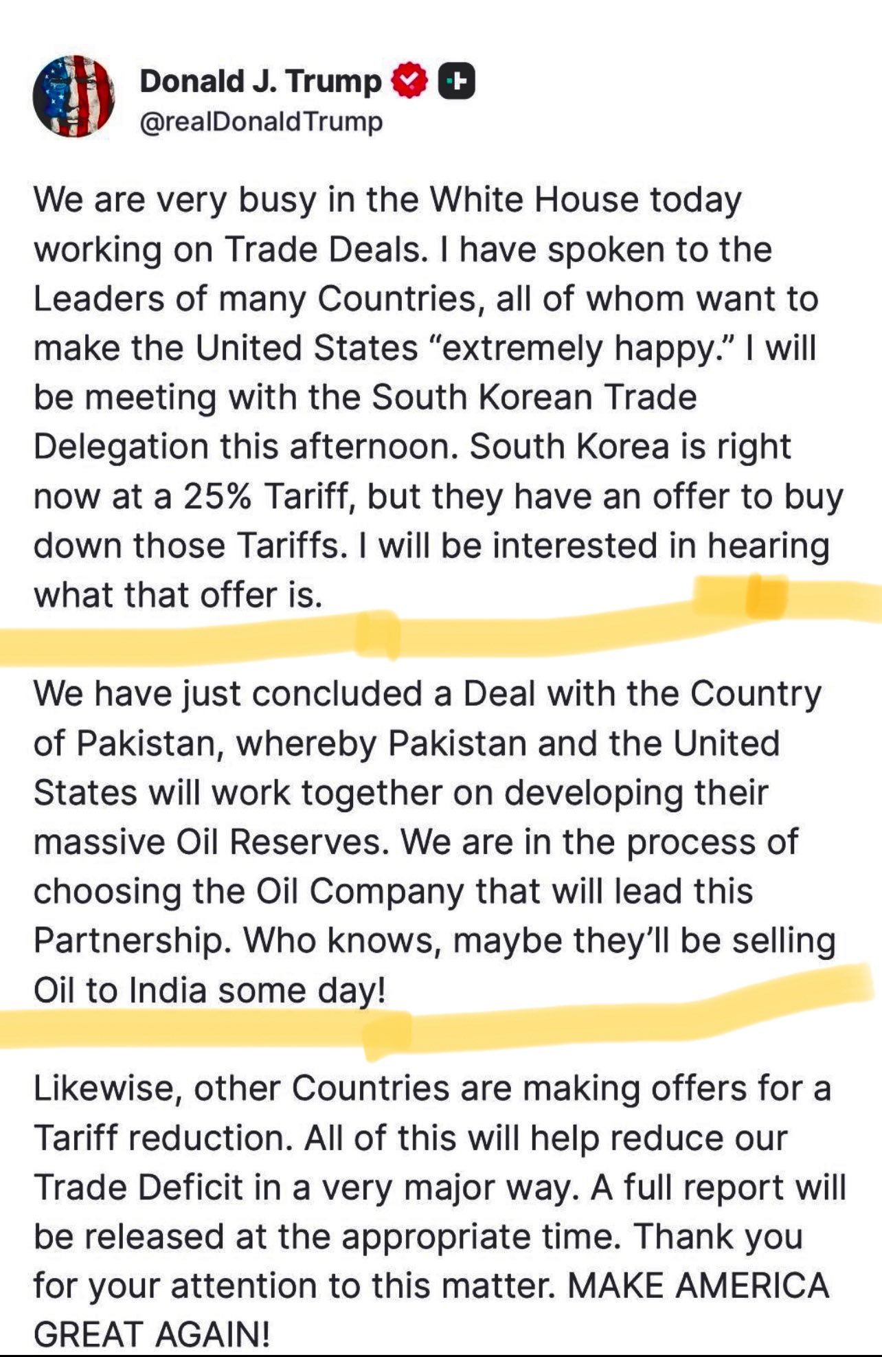 "الحمداللہ! پاکستان کی امریکا کے ساتھ ڈیل طے پا گئی ہے۔ یہ معاہدہ ملکی معیشت کے لیے ایک مضبوط سنگ میل ثابت ہوگا۔”