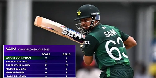 ایشیا کپ کے سپر فور مرحلے میں دبئی اسٹیڈیم میں کھیلے گئے اہم میچ میں صائم ایوب صاحبزادہ فرحان کے آؤٹ ہونے کے بعد بیٹنگ کے لیے آئے۔ شائقین نے توقع باندھ رکھی تھی کہ وہ ٹیم کے لیے لمبی اننگز کھیلیں گے، مگر وہ پہلی ہی گیند پر صفر پر آؤٹ ہوکر پویلین لوٹ گئے۔ یہ رواں ایشیا کپ میں ان کا چوتھا صفر تھا۔